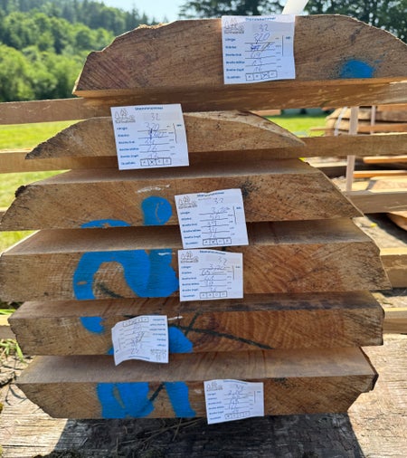 Holzart: Erle; Länge: 3,2 m; Breite Mittel: 0,45 m; DIVERSE Bohlen verfügbar; geschlagen: 10.2024; aufgesägt: 06.2025; besäumt: NEIN